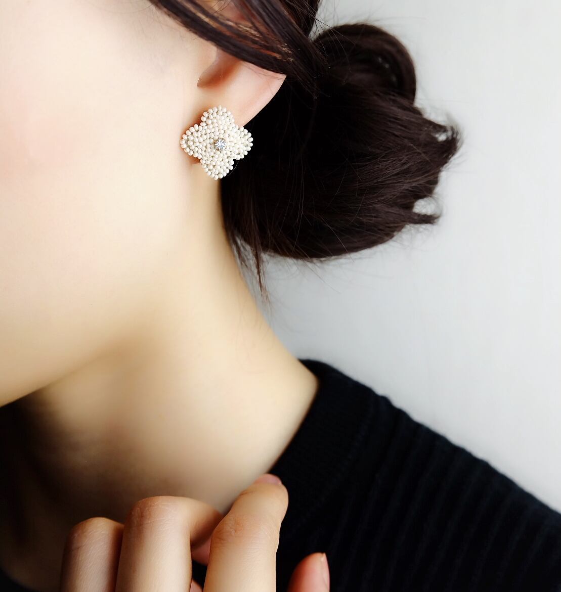 ‘Perles’リングとお揃いのピアス。ご希望の方はイヤリングへの変更も承ります。お気軽にお問い合わせ下さい。