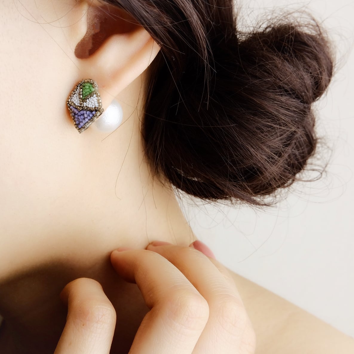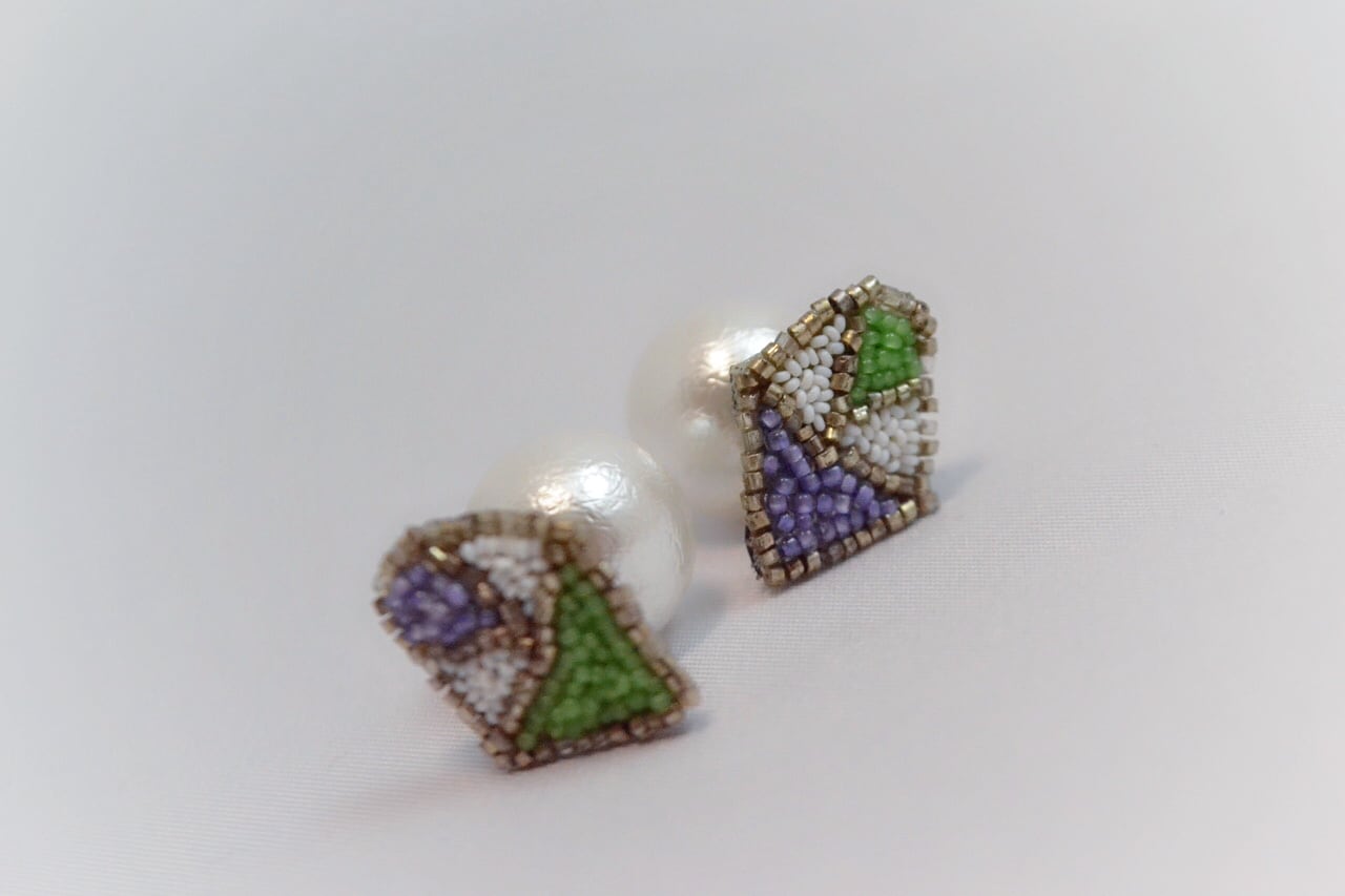 左右で色の配色の異なるダイアモンドをデザインしたピアスです。ピアスキャッチのパールがアクセント。